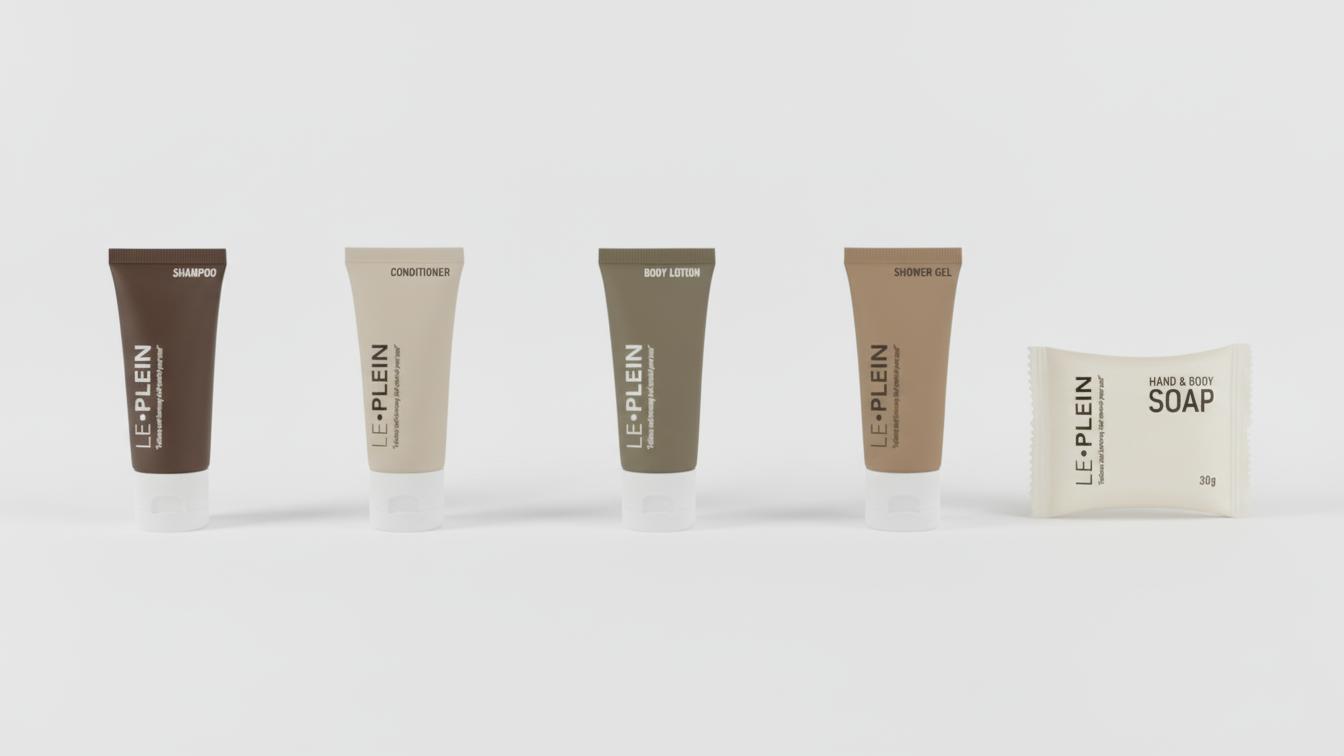 Le Plein Amenidades es una colección de productos de lujo diseñados para elevar la experiencia de sus huéspedes. Este set incluye champú, acondicionador, gel de baño y crema humectante de 40 ml cada uno, más un jabón de manos de 30 gramos. Con un aroma distintivo y formulaciones cuidadosas, transforma cualquier espacio en un refugio de bienestar y elegancia.